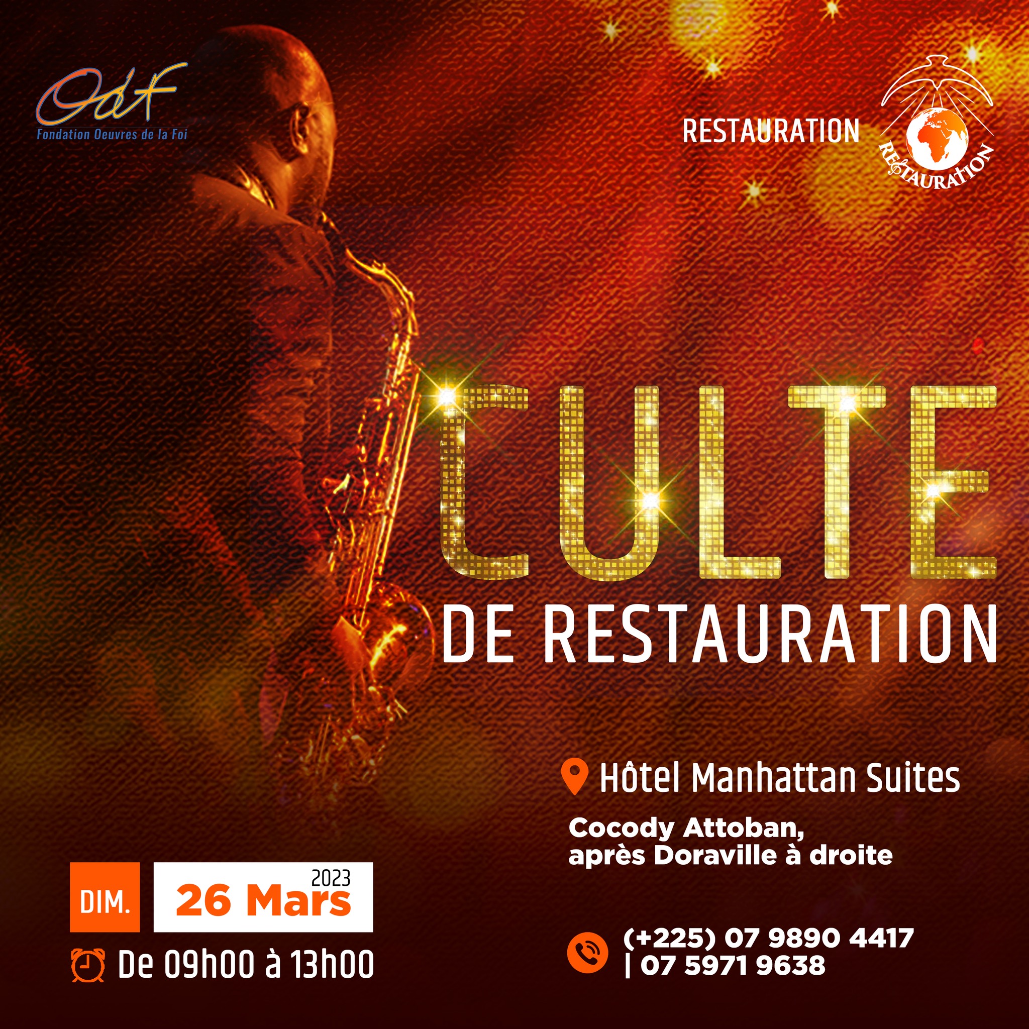 Nous avons le plaisir de vous convier à notre Culte spécial de Restauration, qui se tiendra Dimanche prochain, 26 Mars 2023, à partir de 09H00, à l'Hôtel Manhattan Suites.